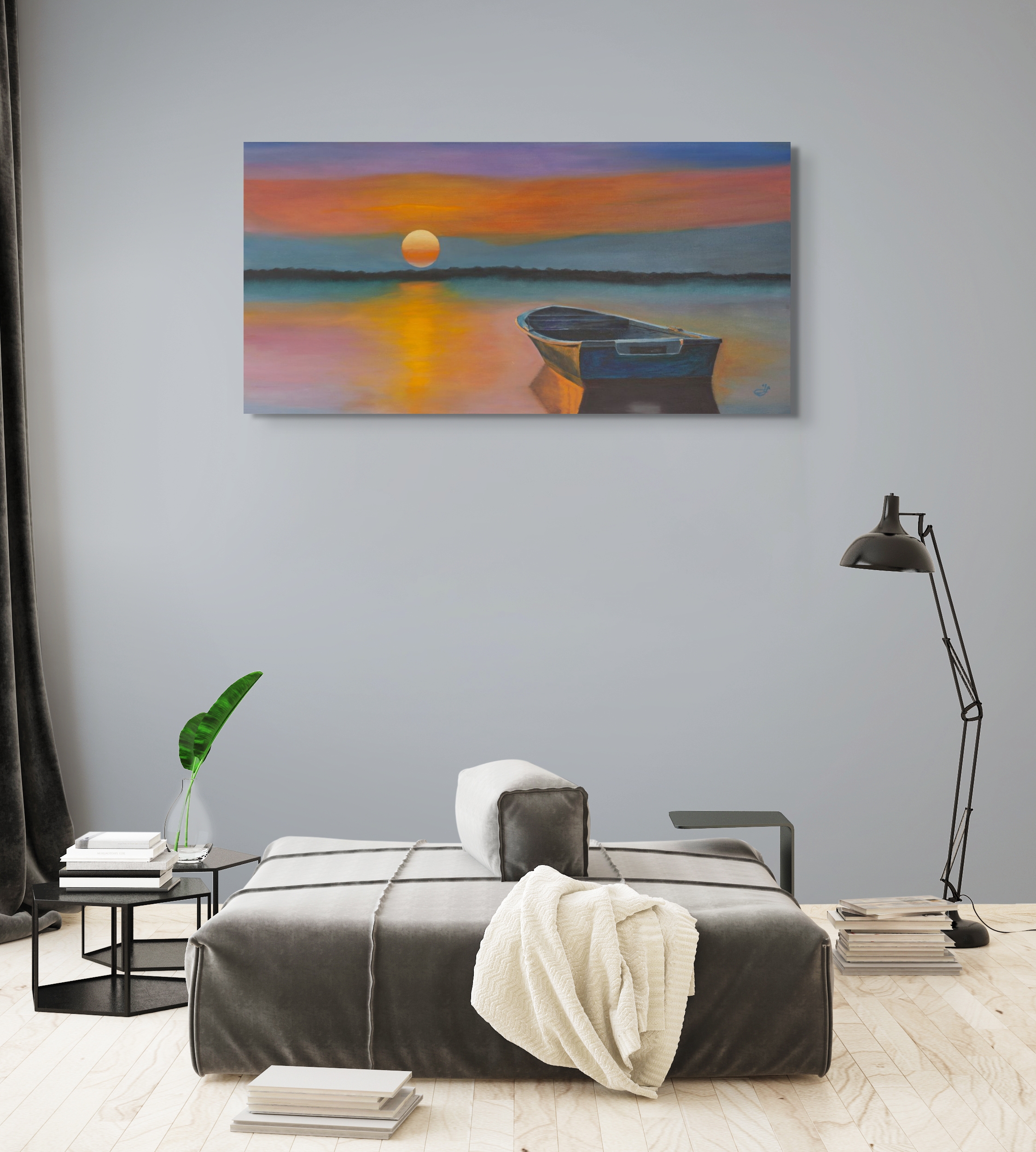 Obraz přímo vybízí k tomu, abychom nasedli do člunu, kochali se krásou zapadajícího slunce a nechali se jen tak volně unášet vánkem a vodními proudy.