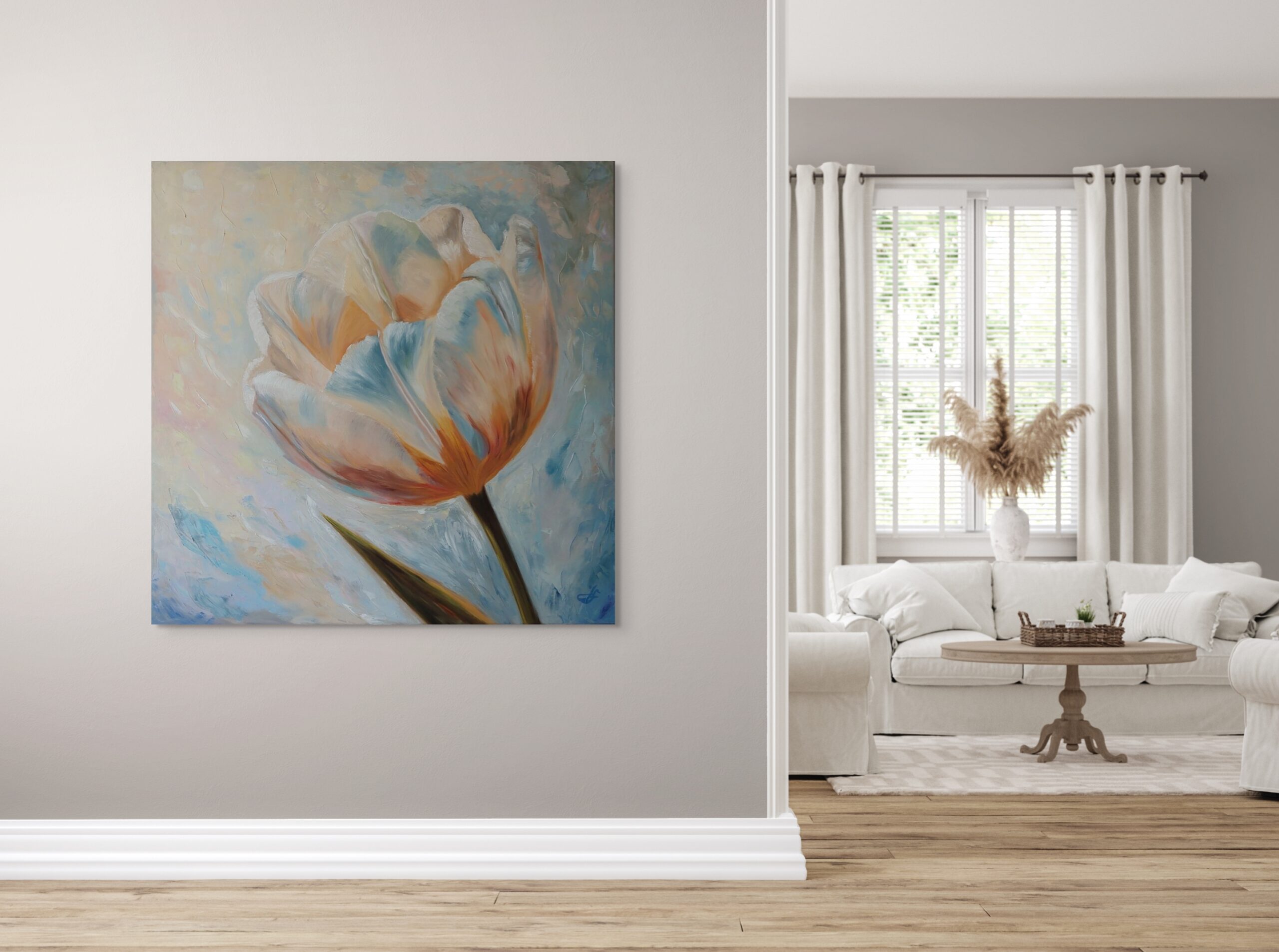 Obraz „Dotek něžné krásy“ zachycuje velký tulipán v plném rozkvětu, jehož plastické tahy štětce dodávají okvětním lístkům živou hloubku a jemnou strukturu. Hra světla a stínů na sametových lístcích vytváří dojem, že se květ téměř vznáší nad plátnem, zatímco jemné odstíny růžové, bílé a zlatavé podtrhují jeho křehkou eleganci.
