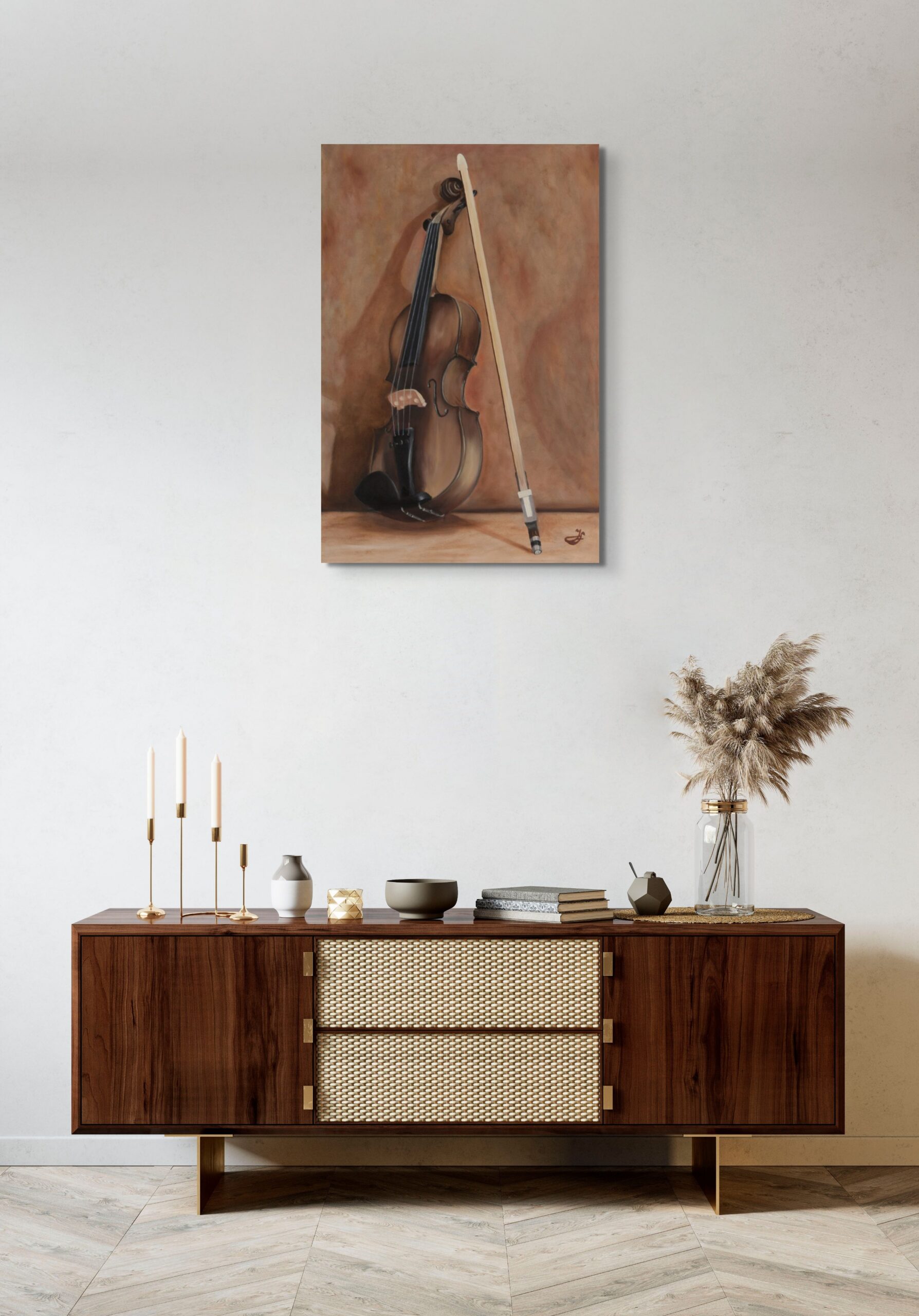 Pro namalování obrazu s motivem houslí mě mj. inspiroval příběh, který stojí za precizní výrobou mistrovských houslí. Většinou se toto umění dědí z generace na generaci a např. dřevo na výrobu houslí obstarává děda pro svého vnuka, aby ten pak měl z čeho vyrábět. Nic se u mistrovských houslí nesmí uspěchat, pro některé kusy schne dřevo i desítky let. Základem je ta správná rezonance dřeva. Každé takové housle pak představují naprosto jedinečné dílo, kterému mistr houslař věnoval určitý čas svého života a srdce…