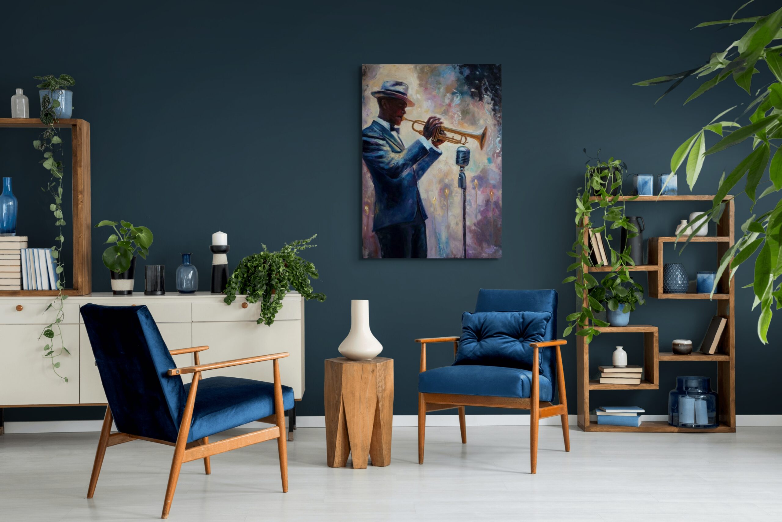 Vneste do svého prostoru rytmus a vášeň jazzové hudby – obraz s trumpetistou zachytí kouzlo okamžiku a naplní váš domov atmosférou živého vystoupení.