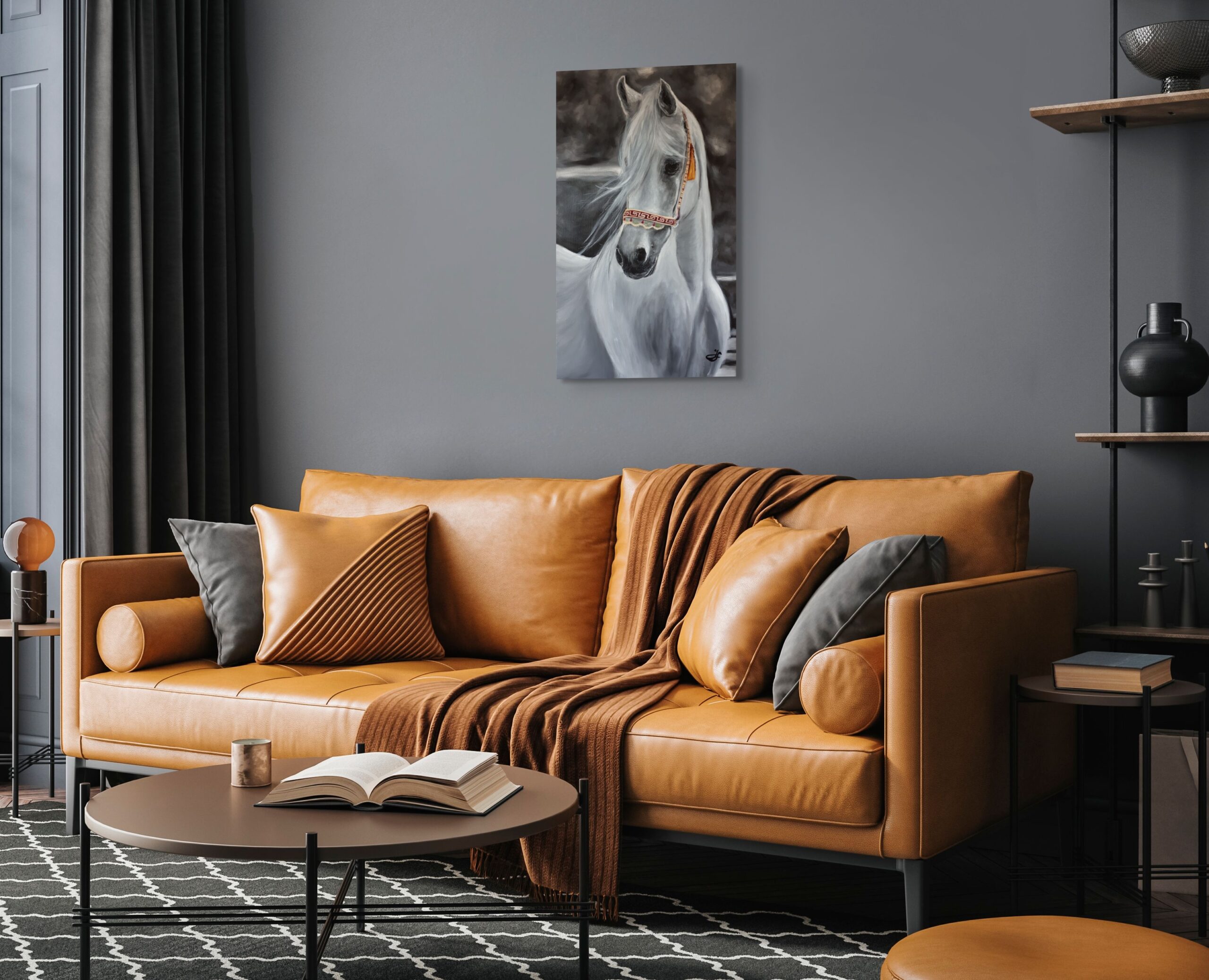 Zvláštní pohled tím jedním okem, vlající hříva a kontrast mezi bílošedou srstí a barevnou výšivkou této princezny mě doslova uchvátil a moc jsem si přál vyjádřit ušlechtilost tohoto stvoření prostřednictvím tohoto obrazu.