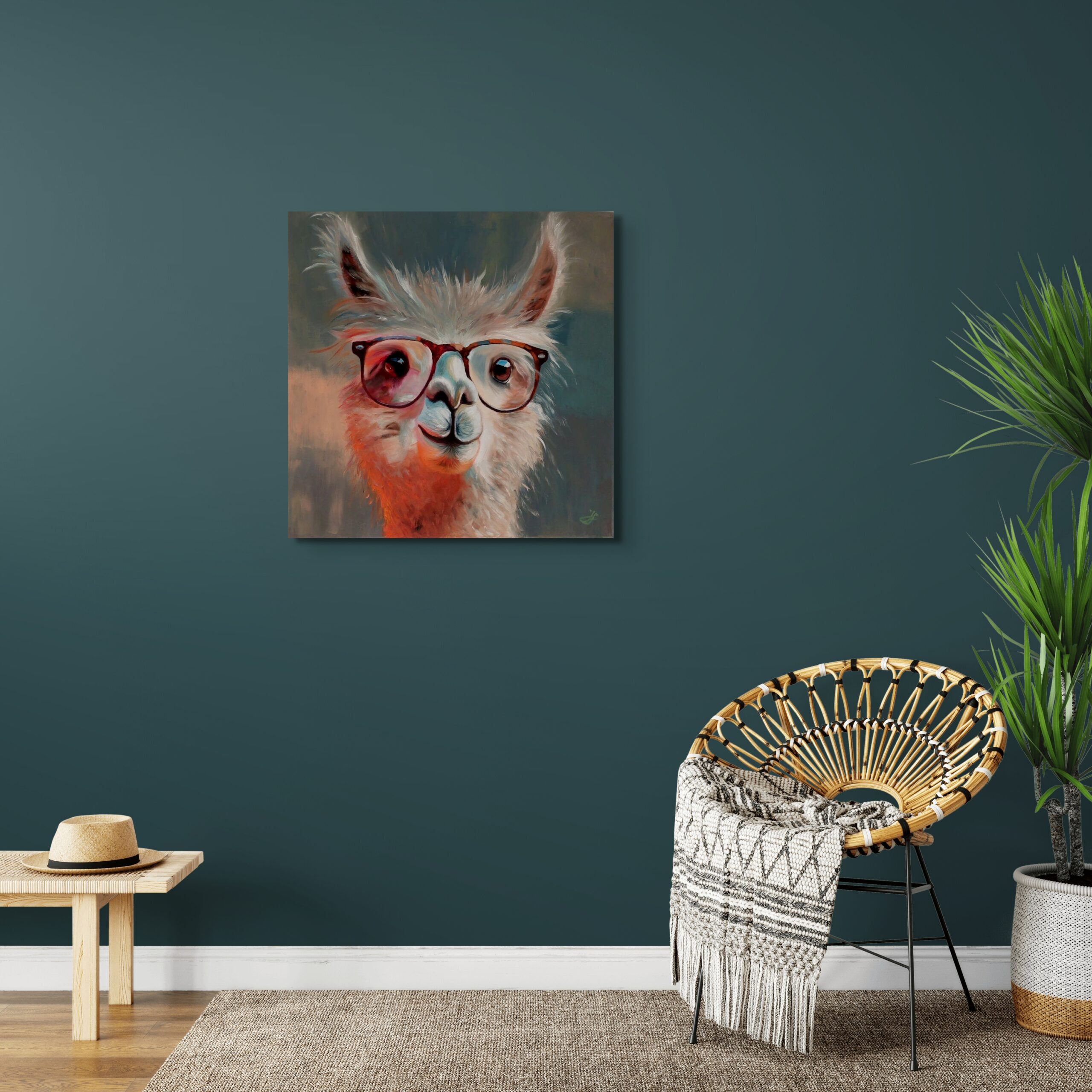 Obraz zachycuje roztomilou lamu s jemným, veselým úsměvem, která působí klidným a pozitivním dojmem. Na jejím nose sedí vtipné, barevné brýle, které dodávají celé scéně hravost a osobitý styl. Název obrazu „Don’t worry, be happy“, dokonale podtrhuje bezstarostnou a optimistickou atmosféru obrazu.