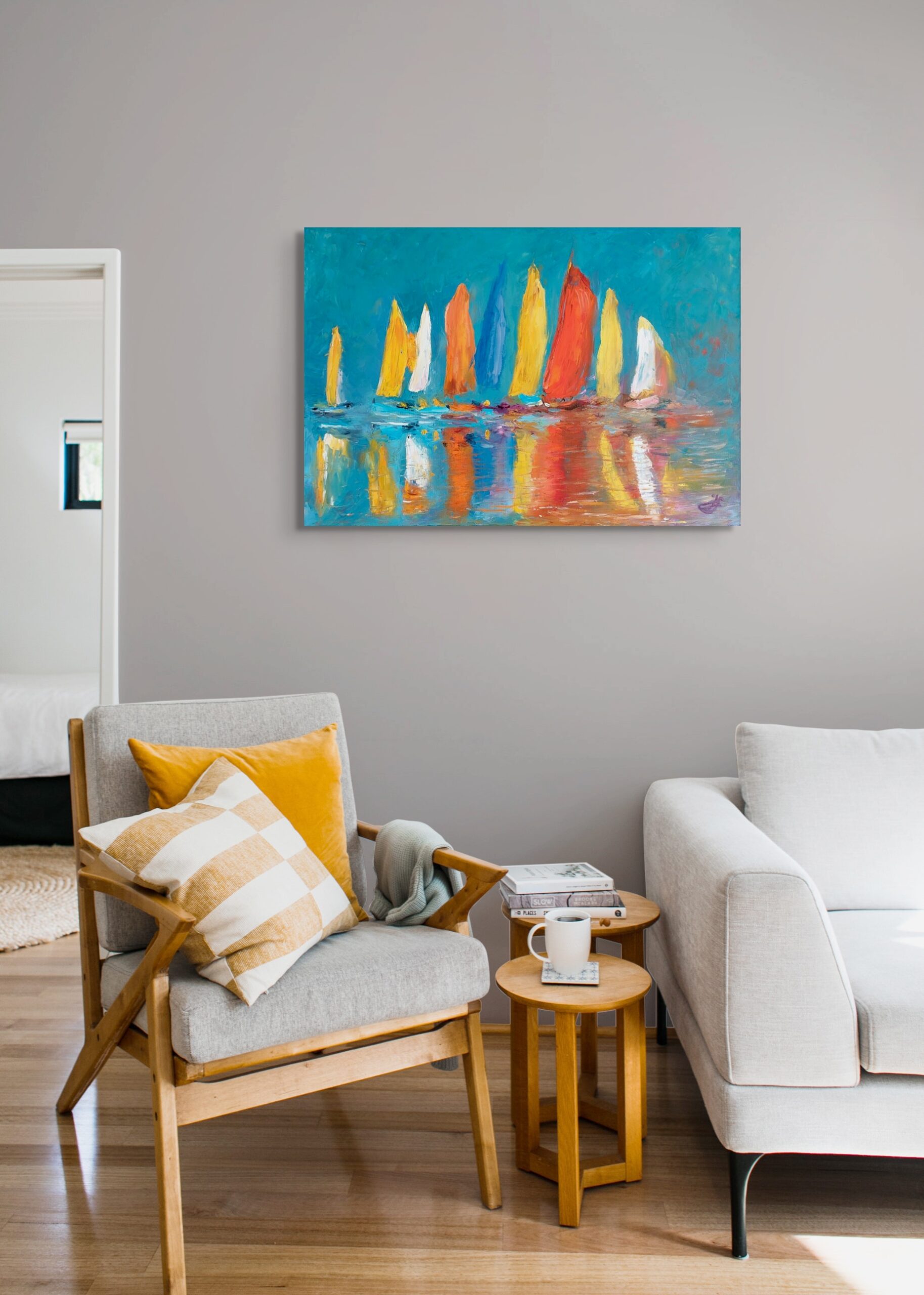 Obraz Plachetnicový rej přináší dynamickou scenérii barevných plachetnic, jejichž odrazy se míhají na vodní hladině. Expresivní plastická malba dodává dílu energii a pohyb, jako by vítr rozehrával hru světel a barev. Tento obraz osloví každého, kdo miluje svobodu, dobrodružství a kouzlo nekonečné vodní hladiny.