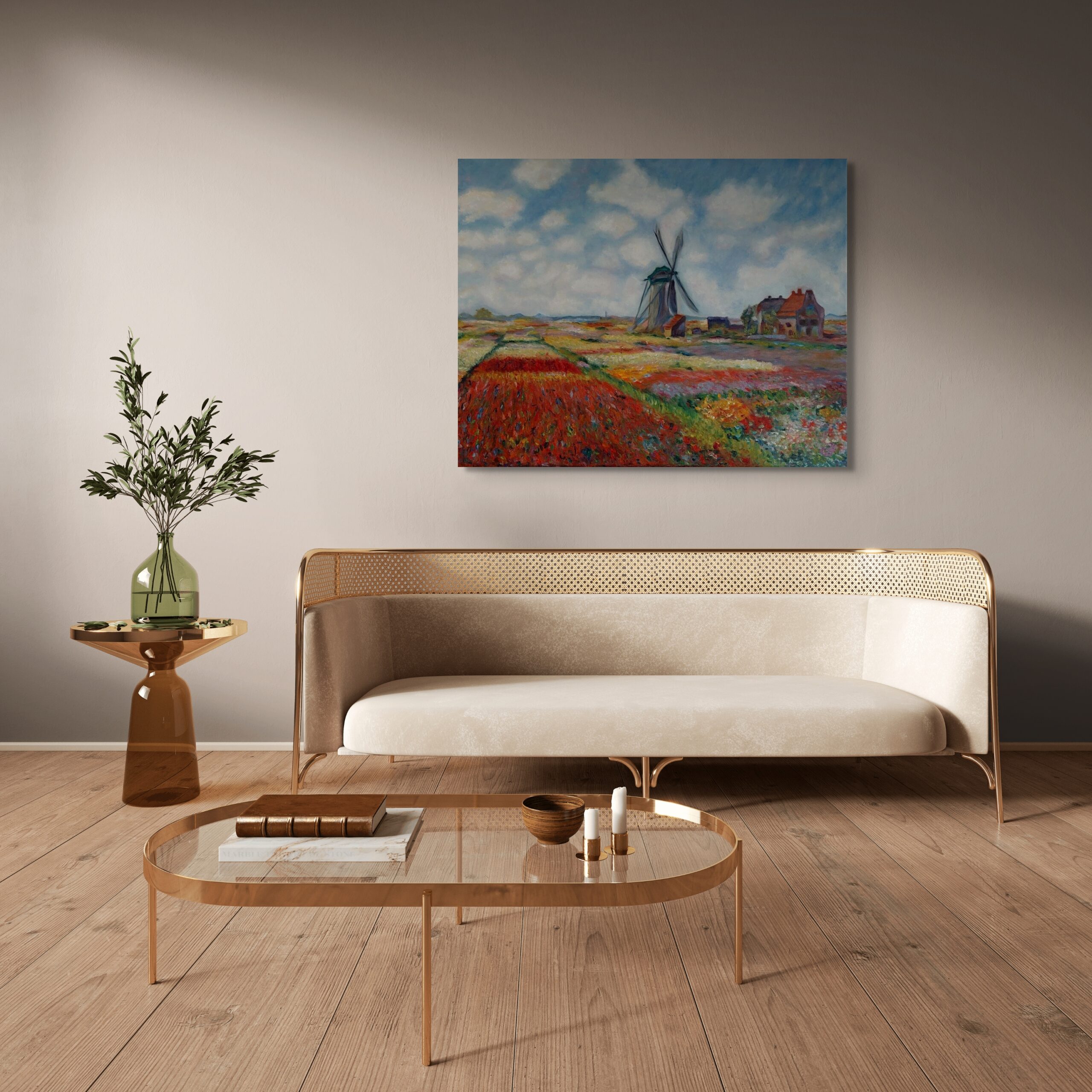 Tento obraz, inspirovaný Monetovým mistrovským dílem, zachycuje malebné holandské pole plné pestrobarevných tulipánů, které se jemně vlní ve větru. V dálce se rýsuje ikonický větrný mlýn, dotvářející atmosféru klidné krajiny zalité jemným světlem. Svěží tahy štětce a hra barev dodávají obrazu impresionistickou lehkost a živost, čímž je vzdána pocta Monetově umělecké vizi.
